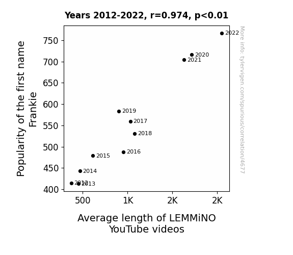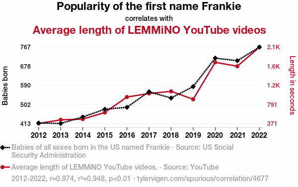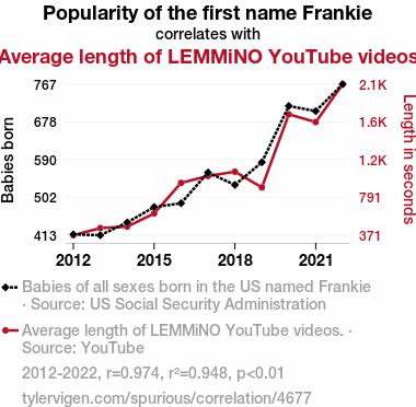 - The spurious research paper: A Frank-ly Lengthy Exploration: The Relationship between the Popularity of the First Name Frankie and the Average Length of LEMMiNO YouTube Videos