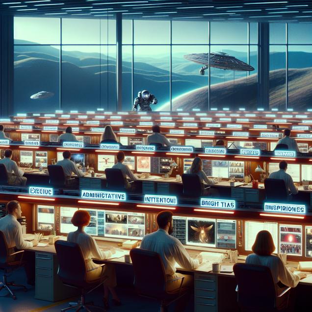 Prompt: An image that looks like it is a scene from 'Star Wars', depicting this scene: In a quiet Oklahoma office, the number of executive administrative assistants dwindles as they work diligently to generate brilliant and insightful video titles for Extra History YouTube videos. With each assistant hard at work brainstorming, the impact of their effort is evident as the exceptional and thought-provoking video titles come to life. But as the number of assistants decreases, the bustling creativity of the office slowly dwindles, reflecting the diminishing pool of innovative titles for the videos. Improvement: An image that looks like it is a scene from 'Star Wars', depicting this scene: In a quiet Oklahoma office, the number of executive administrative assistants dwindles as they work diligently to generate brilliant and insightful video titles for Extra History YouTube videos. Each assistant surrounded by holographic displays, projecting captivating and thought-provoking video titles coming to life through their brainstorming efforts. Yet, as the number of assistants decreases, the bustling creativity of the office slowly dwindles, reflecting the diminishing pool of innovative titles for the videos. The depiction should include only scenes, people, and objects, it should not include text or speech bubbles.