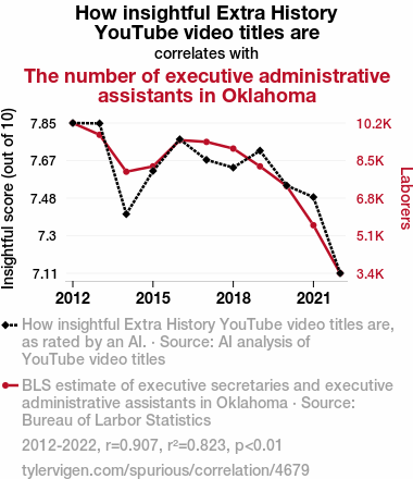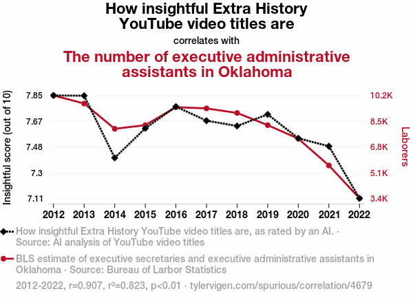This means 82.3% of the change in the one variable (i.e., The number of executive administrative assistants in Oklahoma) is predictable based on the change in the other (i.e., How insightful Extra History YouTube video titles are) over the 11 years from 2012 through 2022.