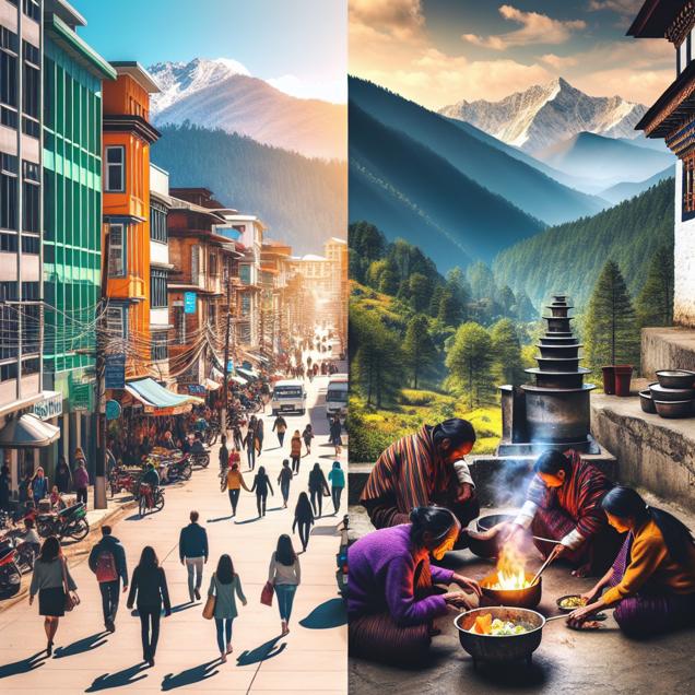 Prompt: Create an image of contrasting atmospheres between a bustling street in Dubuque, Iowa, and the serene mountains of Bhutan. Show people in Dubuque strolling under a bright sky, with vibrant details such as colorful buildings and lush trees. In contrast, depict families in Bhutan cooking together around a warm, clean-burning Liquefied Petroleum Gas stove, with the picturesque mountains in the background. The scene should encapsulate the positive impact of clean air and the connection between the two locations. The depiction should include only scenes, people, and objects, it should not include text or speech bubbles.