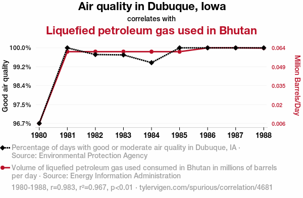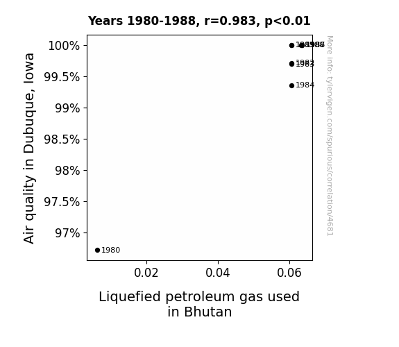 This means 96.7% of the change in the one variable (i.e., Liquefied petroleum gas used in Bhutan) is predictable based on the change in the other (i.e., Air quality in Dubuque, Iowa) over the 9 years from 1980 through 1988.