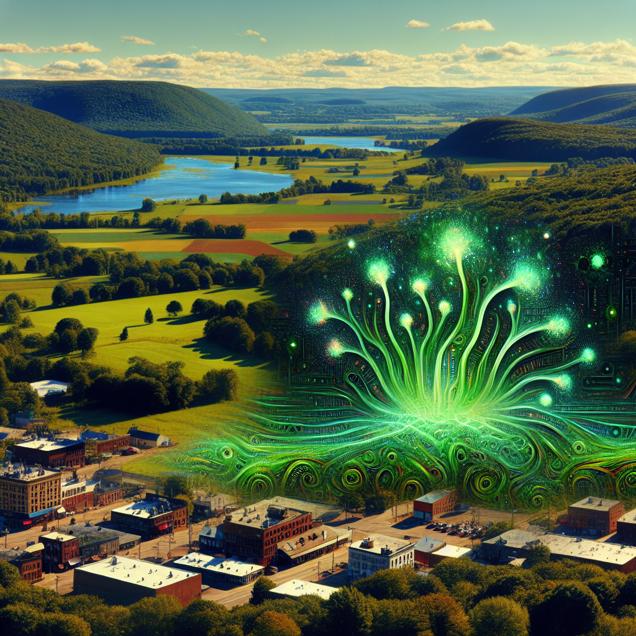 Prompt: [A photo-realistic image] An aerial view of Elmira, New York, showcasing the serene landscape of rolling hills and clear blue skies. Amidst the natural beauty, a cluster of vibrant green algae, Phisherus maximus, blankets a small pond, their intricate patterns resembling digital circuitry. The algae release luminous spam emails that drift into the air and scatter, spreading their digital spores across the entire scene. Glowing in the sunlight, the algae's unique adaptation to the environment is visually captivating, creating an otherworldly and compelling depiction of nature's intersection with technology. The depiction should include only scenes, people, and objects, it should not include text or speech bubbles.