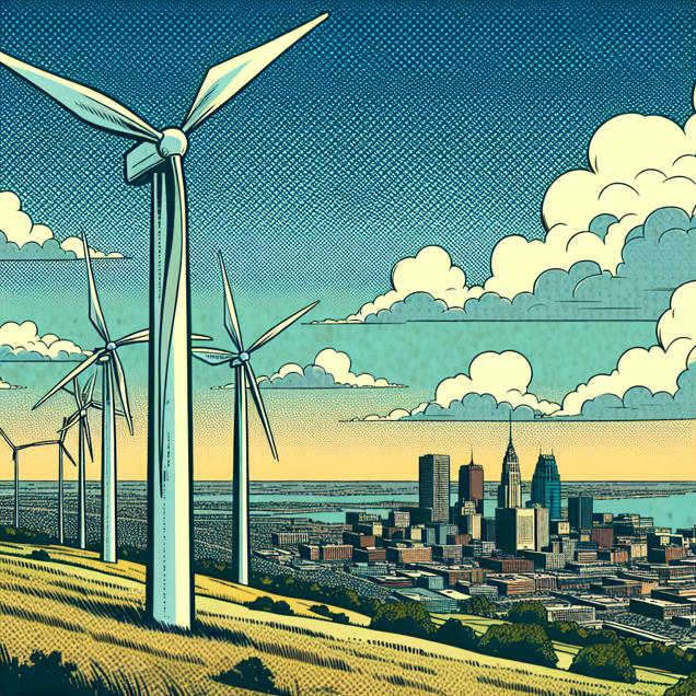 Prompt: Generate a comic-book-style illustration with muted colors and a dotted halftone pattern from the 1960s. Depict a clear blue sky over Bay City, Michigan with wind turbines spinning vigorously in the British Virgin Islands. The clean air in Bay City has created a powerful gust of wind propelling the turbines, symbolizing the positive impact of reduced air pollution on renewable energy generation. Keep the visual depiction simple, with no words or speech bubbles. The depiction should include only scenes, people, and objects, it should not include text or speech bubbles.