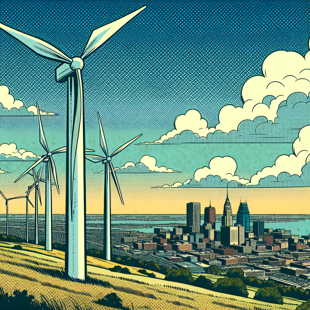 ChatGPT: Generate a comic-book-style illustration with muted colors and a dotted halftone pattern from the 1960s. Depict a clear blue sky over Bay City, Michigan with wind turbines spinning vigorously in the British Virgin Islands. The clean air in Bay City has created a powerful gust of wind propelling the turbines, symbolizing the positive impact of reduced air pollution on renewable energy generation. Keep the visual depiction simple, with no words or speech bubbles.