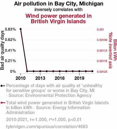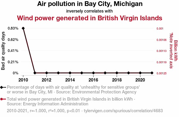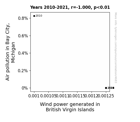 This means 100% of the change in the one variable (i.e., Wind power generated in British Virgin Islands) is predictable based on the change in the other (i.e., Air pollution in Bay City, Michigan) over the 12 years from 2010 through 2021.