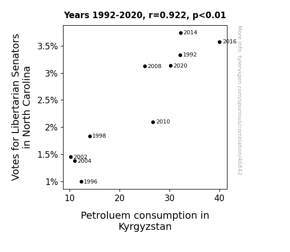 This means 85.1% of the change in the one variable (i.e., Petroluem consumption in Kyrgyzstan) is predictable based on the change in the other (i.e., Votes for Libertarian Senators in North Carolina) over the 10 years from 1992 through 2020.