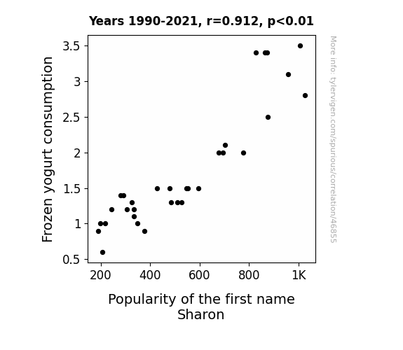 This means 83.1% of the change in the one variable (i.e., Popularity of the first name Sharon) is predictable based on the change in the other (i.e., Frozen yogurt consumption) over the 32 years from 1990 through 2021.