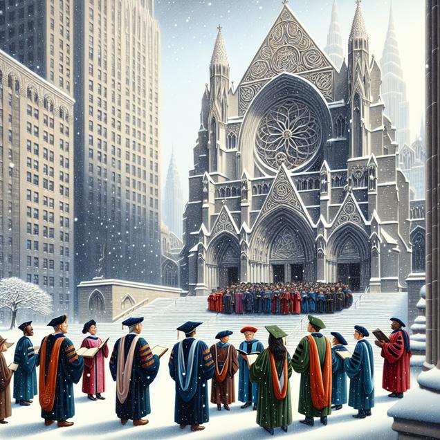 ChatGPT: Create an image of a snow-covered New York City with a majestic cathedral standing tall. The cathedral displays intricate Celtic art and its spires and arches reach towards the sky. On the steps of the cathedral, a group of scholars and theologians in their graduation gowns celebrate their Master's degrees in Theology and religious vocations. As they engage in deep conversations about life's mysteries, white snowflakes gently fall from the sky, adding a serene and contemplative atmosphere to the scene.