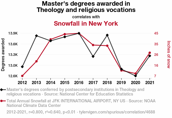 This means 64% of the change in the one variable (i.e., Snowfall in New York) is predictable based on the change in the other (i.e., Master's degrees awarded in Theology and religious vocations) over the 10 years from 2012 through 2021.