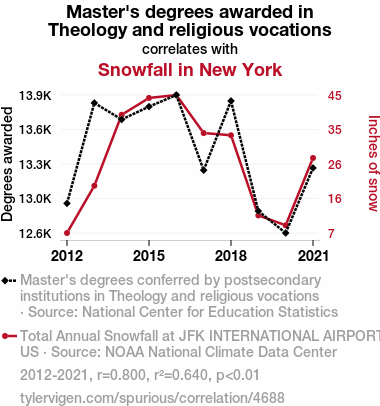theology degrees, religious vocations, snowfall in New York, correlation coefficient, National Center for Education Statistics, NOAA National Climate Data Center, vocational aspirations, Master's degrees awarded in Theology, religious career choices, weather influence on career choices