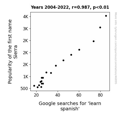 This means 97.4% of the change in the one variable (i.e., Google searches for 'learn spanish') is predictable based on the change in the other (i.e., Popularity of the first name Sierra) over the 19 years from 2004 through 2022.
