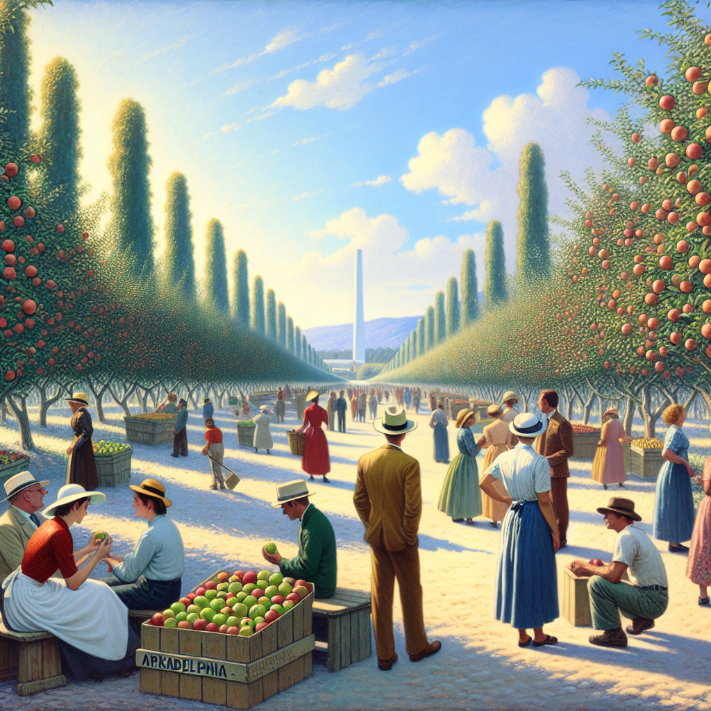 ChatGPT: Generate an image of an apple orchard in Arkadelphia, Arkansas, with a clear blue sky overhead. The focus should be on the apple trees gently swaying in the breeze, with customers leisurely strolling through the local apple market in the background. The scene should emanate a serene and contented atmosphere, with the air filled with the sweet scent of blossoming orchards. The image should also capture the harmony between the flourishing apple orchards and the revitalized air quality, enhancing customer satisfaction with Apple products.