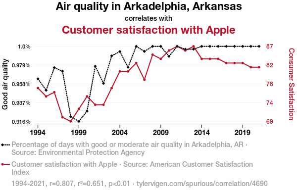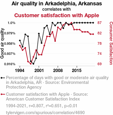 - The spurious research paper: Astonishing Air Quality and Apple Affinity: Analyzing the Association Between Air Quality in Arkadelphia, Arkansas and Customer Satisfaction with Apple