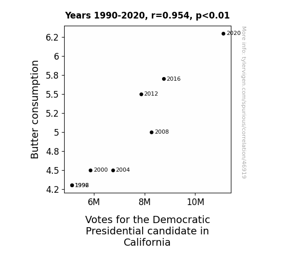 This means 91.1% of the change in the one variable (i.e., Votes for the Democratic Presidential candidate in California) is predictable based on the change in the other (i.e., Butter consumption) over the 8 years from 1990 through 2020.