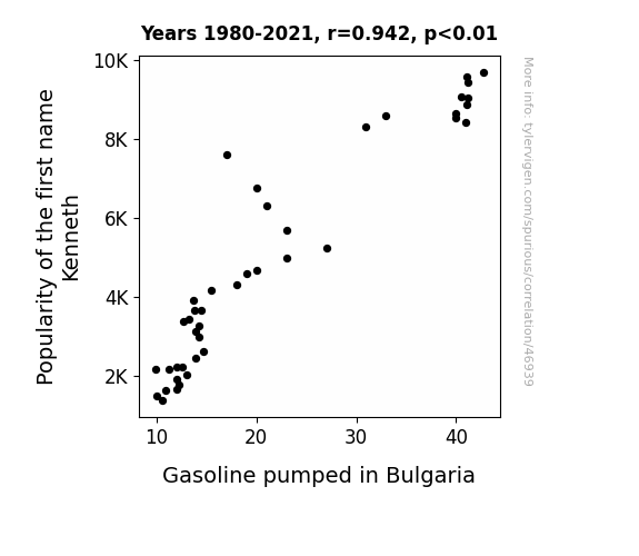 This means 88.7% of the change in the one variable (i.e., Gasoline pumped in Bulgaria) is predictable based on the change in the other (i.e., Popularity of the first name Kenneth) over the 42 years from 1980 through 2021.