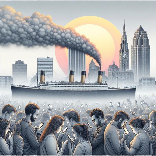 ChatGPT: In Toledo, the city skyline is shrouded in a dense haze of smog, with the sun struggling to break through. Amidst the polluted air, individuals are seen on their smartphones, searching for 'Titanic' as their curiosity about the historic ship reaches a peak.