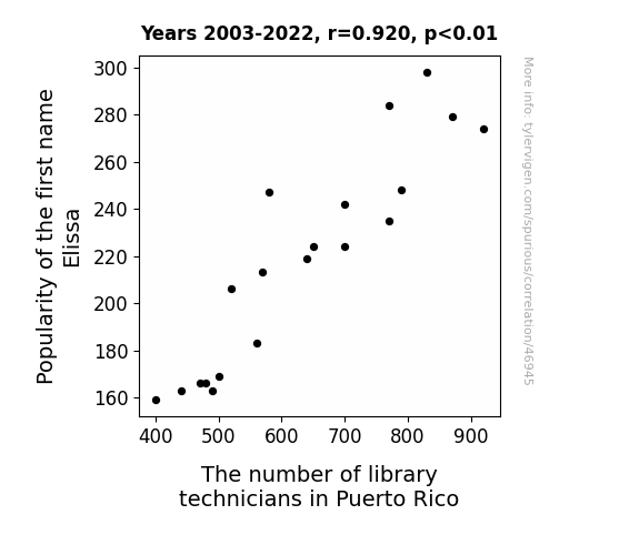 This means 84.6% of the change in the one variable (i.e., The number of library technicians in Puerto Rico) is predictable based on the change in the other (i.e., Popularity of the first name Elissa) over the 20 years from 2003 through 2022.