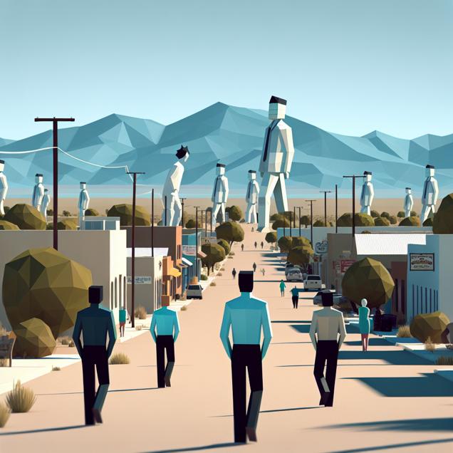 ChatGPT: Generate an image of a low poly landscape of Deming, New Mexico under a clear sky. The scene should show content people walking outside, enjoying the fresh air. Rather than a bustle of activity, the town is quiet, with low poly figures in the distance. A subtle nod to the decline of "Gangnam Style" can be represented by a minimalistic visual element that conveys the absence of the once popular dance craze in the town, perhaps through the representation of quiet streets and a serene atmosphere.