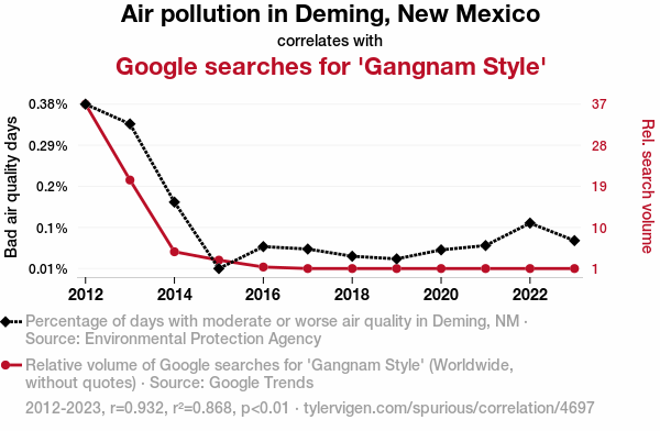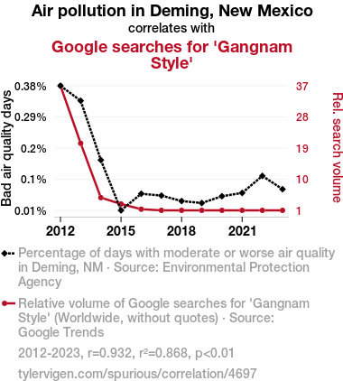 - The spurious research paper: Gangnam Air: A Study on the Correlation between Air Pollution in Deming, New Mexico and Google Searches for 'Gangnam Style'