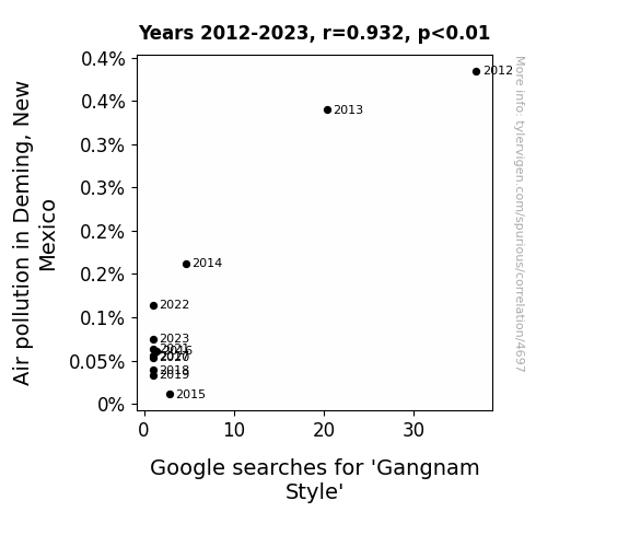 Our analysis of the data revealed a remarkably strong correlation between air pollution levels in Deming, New Mexico and Google searches for 'Gangnam Style' over the period from 2012 to 2023. The correlation coefficient of 0.9318336 indicated a highly positive relationship, which, much like a catchy song, was hard to get out of our heads. It seems that when the air quality dropped, the search interest in Psy's horse-riding anthem went up, proving that even in the world of statistics, opposites can attract – just like the magnetic pull of a chart-topping K-pop melody.