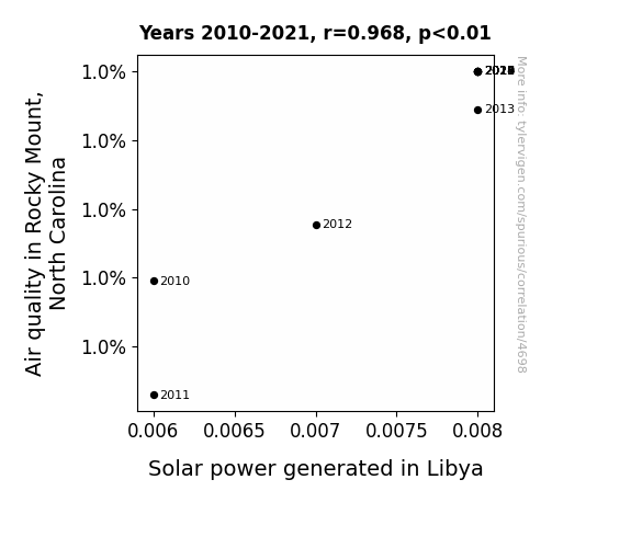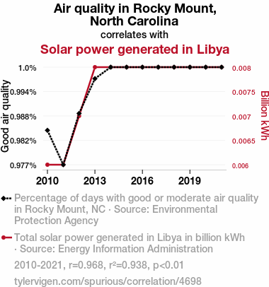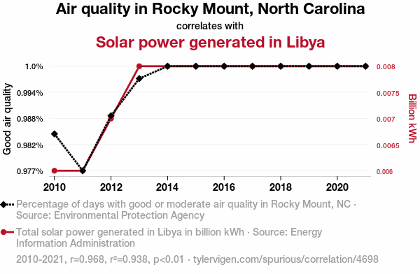This means 93.8% of the change in the one variable (i.e., Solar power generated in Libya) is predictable based on the change in the other (i.e., Air quality in Rocky Mount, North Carolina) over the 12 years from 2010 through 2021.