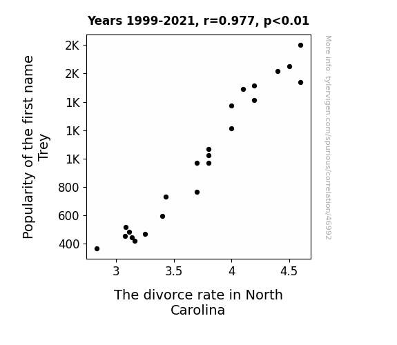 This means 95.5% of the change in the one variable (i.e., The divorce rate in North Carolina) is predictable based on the change in the other (i.e., Popularity of the first name Trey) over the 23 years from 1999 through 2021.