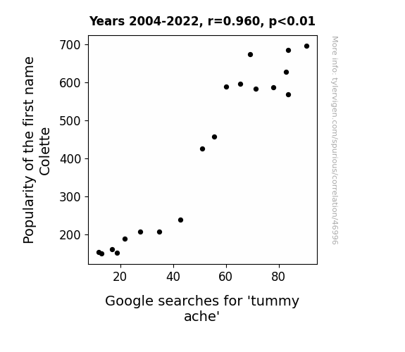 This means 92.2% of the change in the one variable (i.e., Google searches for 'tummy ache') is predictable based on the change in the other (i.e., Popularity of the first name Colette) over the 19 years from 2004 through 2022.