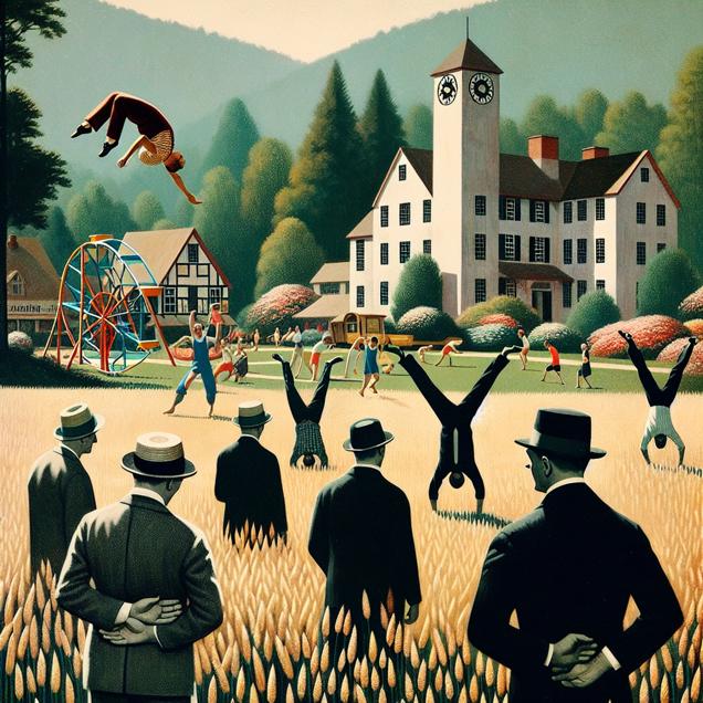 ChatGPT: Generate an image inspired by Bauhaus, depicting a scene in Lynchburg, Virginia. The clean and fresh air prompts people to somersault and do cartwheels, while some clutch their tummies feeling unwell. Simultaneously, a surge in Google searches for 'tummy ache' from the area is occurring. Capture the contrast between the carefree acrobatics and the emerging discomfort that contrasts the idyllic setting.