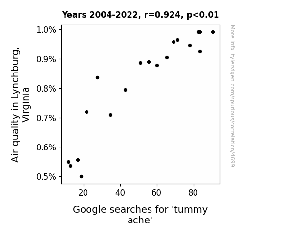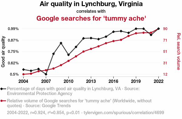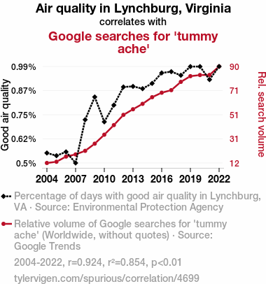 - The spurious research paper: Smoke Signals: Investigating the Relationship Between Air Quality in Lynchburg, Virginia and Google Searches for 'Tummy Ache'