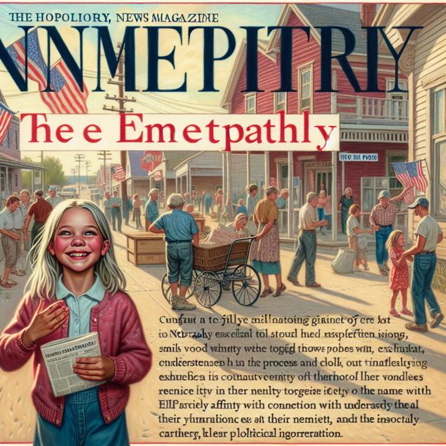 ChatGPT: Generate an image of a TIME magazine cover featuring a young girl named Emani standing in a small town in Nebraska. She walks through the streets, smiling and waving at people, while a sense of connection to her name and the word 'empathy' radiates from her. Inside a polling station, local residents cast their votes for the Democratic Presidential candidate, drawn to the qualities of empathy and understanding that the candidate embodies. The image should evoke a sense of warmth and community, capturing the essence of empathy and goodwill in a small-town setting.