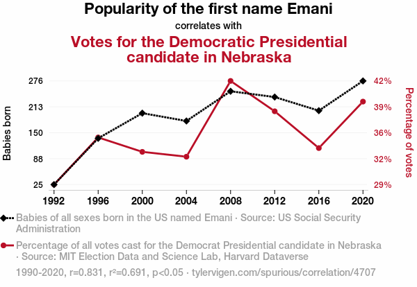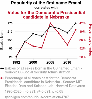 This means 69.1% of the change in the one variable (i.e., Votes for the Democratic Presidential candidate in Nebraska) is predictable based on the change in the other (i.e., Popularity of the first name Emani) over the 8 years from 1990 through 2020.