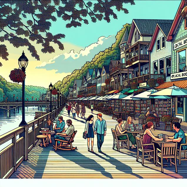 Prompt: [Whimsical illustration] Create an enchanting scene in Watertown, New York, where a serene riverside boardwalk is bustling with happy couples taking leisurely strolls hand in hand. The scene features charming outdoor cafes with couples enjoying the clear air and each other's company. The local bookstore's xkcd comic section is noticeable by its fewer readers, as people are too engrossed in creating their own romantic adventures to linger over the pages. The depiction should include only scenes, people, and objects, it should not include text or speech bubbles.