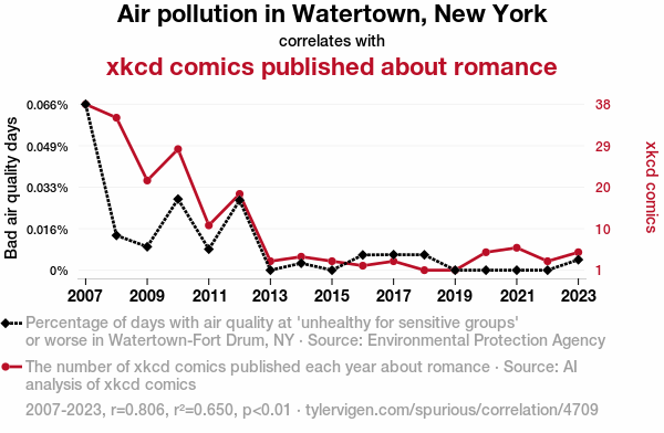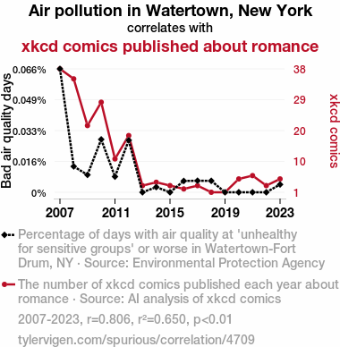 A linear line chart with years as the X-axis and two variables on the Y-axis. The first variable is Air pollution in Watertown, New York and the second variable is xkcd comics published about romance.  The chart goes from 2007 to 2023, and the two variables track closely in value over that time. Small Image