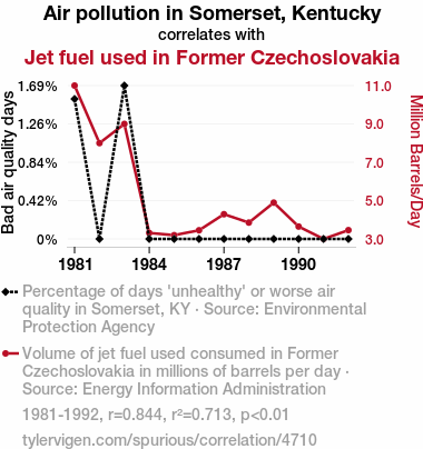 User prompt: Please provide potential search keywords for a paper titled Peculiar Parallels: Probing the Link Between Pollution in Somerset and Propulsion in Former Czechoslovakia with an abstract of In this study, we investigate the seemingly incongruous relationship between air pollution levels in Somerset, Kentucky, and the historical use of jet fuel in former Czechoslovakia. Utilizing data from the Environmental Protection Agency and the Energy Information Administration, our research team unearthed a surprising correlation coefficient of 0.8441790 and p < 0.01 for the years 1981 to 1992. As we delved into this peculiar pairing, our findings revealed a hidden connection that had previously flown under the radar. Our analysis probed both environmental and historical data, deftly navigating the complexities of air quality and aviation history. This investigation not only sheds light on an unexpected linkage but also demonstrates the curious and unforeseen intersections that can arise in scientific inquiry.