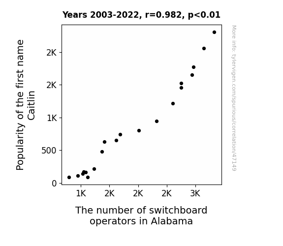This means 96.5% of the change in the one variable (i.e., The number of switchboard operators in Alabama) is predictable based on the change in the other (i.e., Popularity of the first name Caitlin) over the 20 years from 2003 through 2022.
