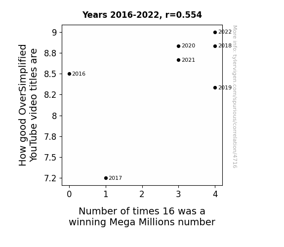 This means 30.6% of the change in the one variable (i.e., Number of times 16 was a winning Mega Millions number) is predictable based on the change in the other (i.e., How good OverSimplified YouTube video titles are) over the 7 years from 2016 through 2022.