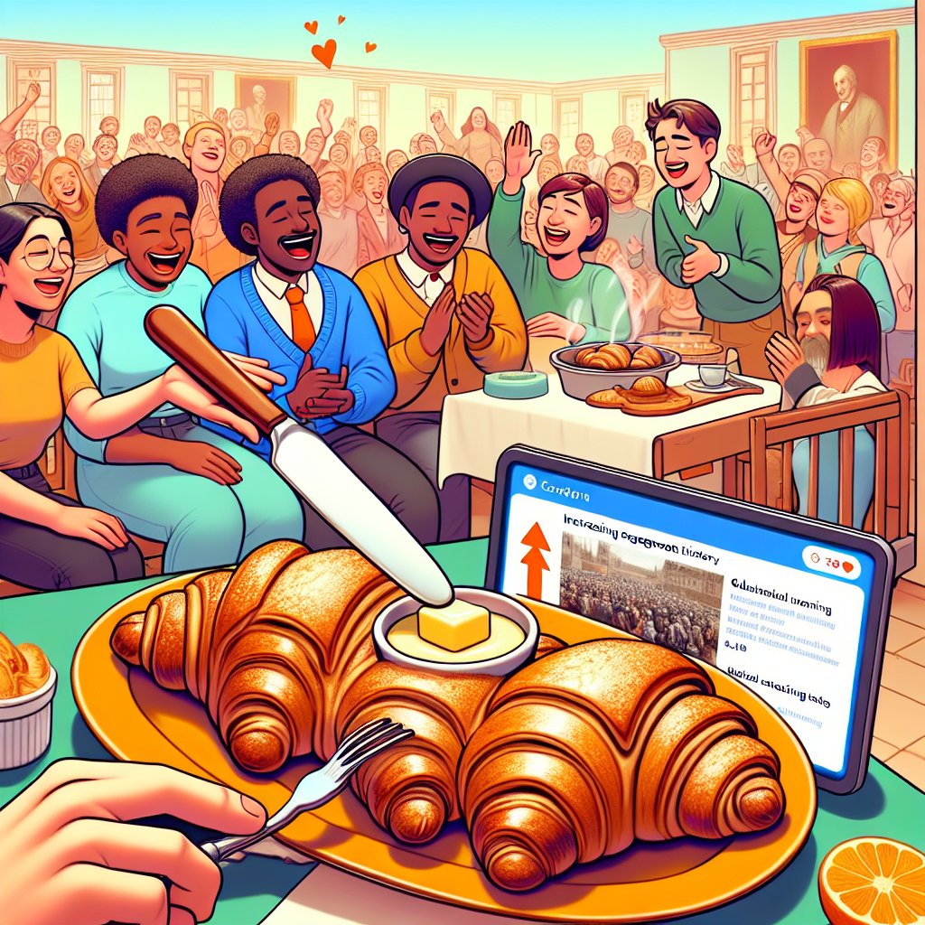 User prompt: Please respond with an image generation prompt that would be likely to create an interesting visual using DALLE-3, using the following style: [ a funny image you would see on reddit ] and depicting this scene: In a cozy kitchen, the table is spread with a variety of baked goods. A plate of warm buttery croissants is front and center, with people eagerly spreading butter on the flaky layers. In the background, a group of friends gather around a laptop, watching an OverSimplified video on historical topics. Their laughing faces and animated gestures suggest that they are thoroughly enjoying the content. The comments section of the video is visible, displaying an increasing number of comments as the video progresses. The scene captures the connection between butter consumption, improved mood, and increased engagement with entertaining historical content. Keep the visual depiction simple. Do not include any words or speech bubbles.