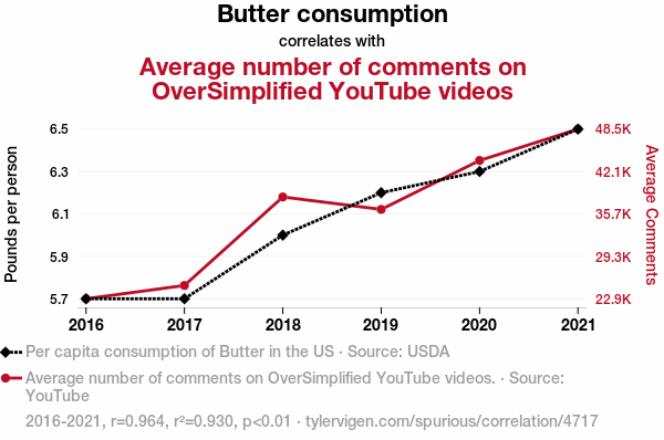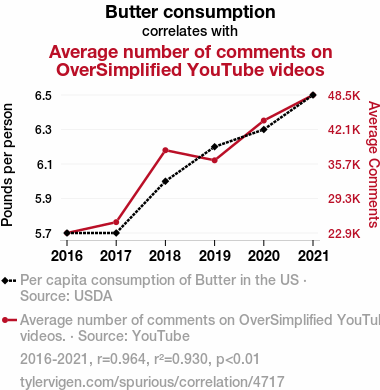 - The spurious research paper: Spreading the Love: A Butterly Connection Between Butter Consumption and Average Number of Comments on OverSimplified YouTube Videos