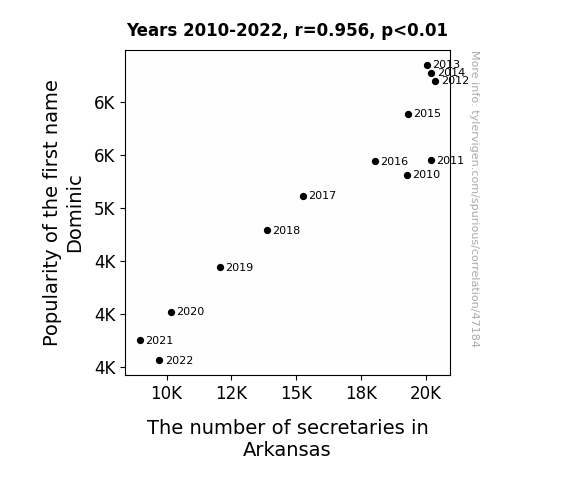 This means 91.4% of the change in the one variable (i.e., The number of secretaries in Arkansas) is predictable based on the change in the other (i.e., Popularity of the first name Dominic) over the 13 years from 2010 through 2022.