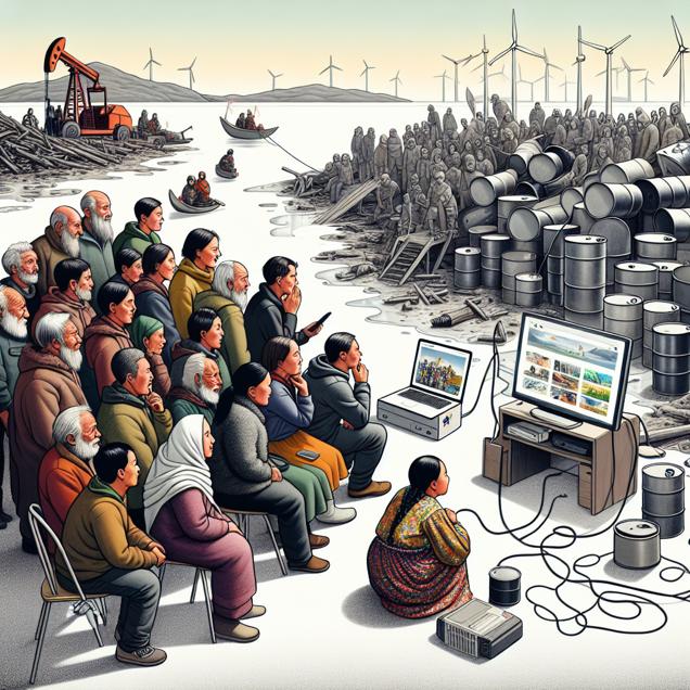 Prompt: Generate an image of a Greenlandic community gathered around a computer, engrossed in an Extra History YouTube video entitled "The Power of Renewable Energy." In the background, showcase the transition from old oil barrels to modern solar panels and wind turbines, symbolizing the shift towards sustainable energy sources. The scene should capture the community's curiosity and enthusiasm for embracing renewable energy, while showcasing the visual contrast between the old and the new. The depiction should include only scenes, people, and objects, it should not include text or speech bubbles.