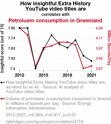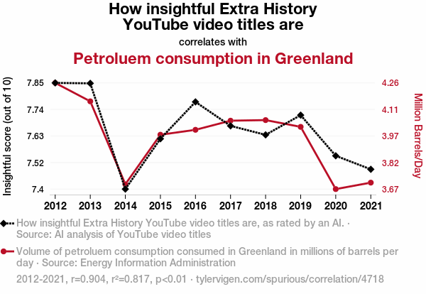 This means 81.7% of the change in the one variable (i.e., Petroluem consumption in Greenland) is predictable based on the change in the other (i.e., How insightful Extra History YouTube video titles are) over the 10 years from 2012 through 2021.