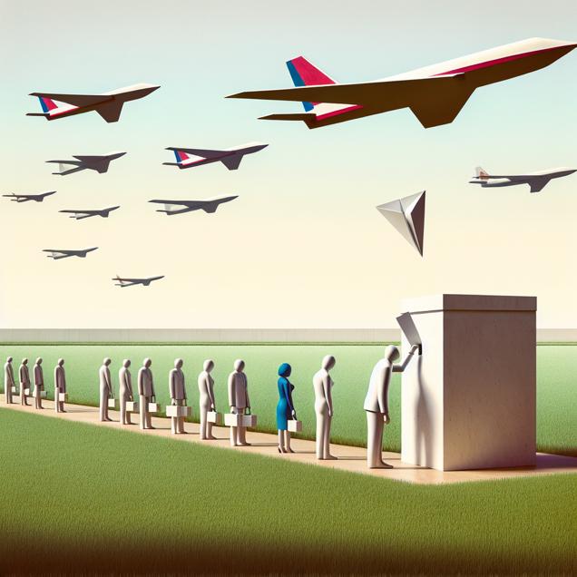ChatGPT: Create an image of a serene grassy field in Arkansas, with a line of minimalistic people patiently waiting to cast their votes. As each person drops their paper ballot into the ballot box, a delicate and stylized paper airplane adorned with the Libertarian Presidential candidate's name ascends gracefully into the air. Against a minimalist backdrop, show streamlined, abstract representations of planes landing and taking off from a sleek and modern airport in Paraguay, symbolizing the sudden surge in air traffic caused by the paper airplanes launched from Arkansas. The serene simplicity of the grassy field contrasts with the ordered chaos of the airport as a result of the paper airplanes, all rendered in a minimalist style.