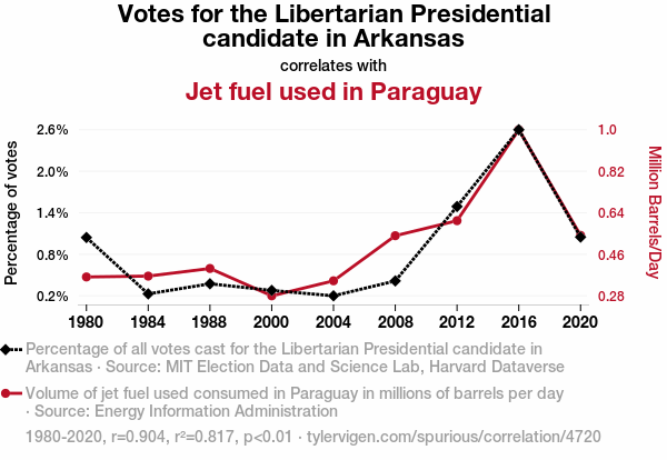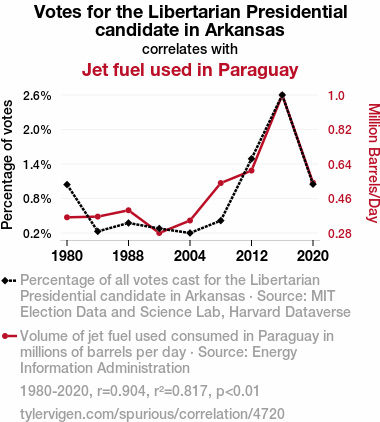 Libertarian presidential candidate, Arkansas, Paraguay, petroleum consumption, jet fuel, correlation, MIT Election Data and Science Lab, Harvard Dataverse, Energy Information Administration, correlation coefficient, p-value, statistical serendipity