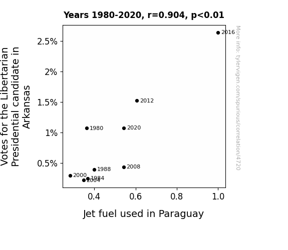 This means 81.7% of the change in the one variable (i.e., Jet fuel used in Paraguay) is predictable based on the change in the other (i.e., Votes for the Libertarian Presidential candidate in Arkansas) over the 9 years from 1980 through 2020.