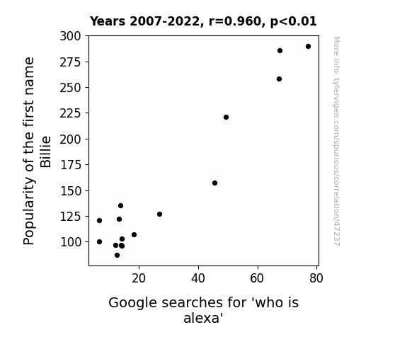 This means 92.3% of the change in the one variable (i.e., Google searches for 'who is alexa') is predictable based on the change in the other (i.e., Popularity of the first name Billie) over the 16 years from 2007 through 2022.