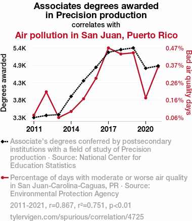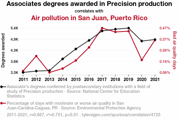 This means 75.1% of the change in the one variable (i.e., Air pollution in San Juan, Puerto Rico) is predictable based on the change in the other (i.e., Associates degrees awarded in Precision production) over the 11 years from 2011 through 2021.