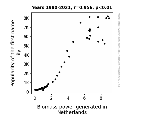 This means 91.5% of the change in the one variable (i.e., Biomass power generated in Netherlands) is predictable based on the change in the other (i.e., Popularity of the first name Lily) over the 42 years from 1980 through 2021.