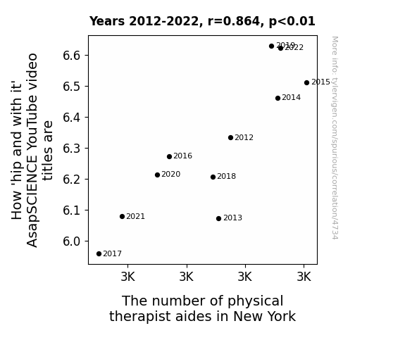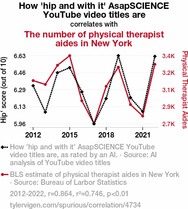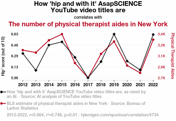 This means 74.6% of the change in the one variable (i.e., The number of physical therapist aides in New York) is predictable based on the change in the other (i.e., How 'hip and with it' AsapSCIENCE YouTube video titles are) over the 11 years from 2012 through 2022.
