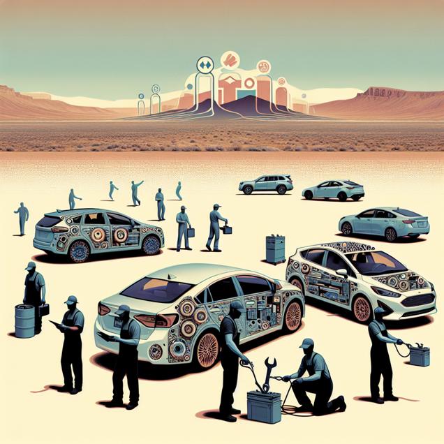 Prompt: Generate an image of a minimalist landscape with a stark, desert backdrop of Utah. In the foreground, depict a line of sleek, minimalist BMW cars lined up, symbolizing the surge in sales and the buzzing activity at the production plant. Incorporate a subtle representation of the ballot counting process as a minimalist abstract graphic, hinting at the Republican Presidential candidate. Add a touch of humor by including a group of mechanic figures working on the BMWs, implying the automotive recalls alongside the election buzz. The depiction should include only scenes, people, and objects, it should not include text or speech bubbles.