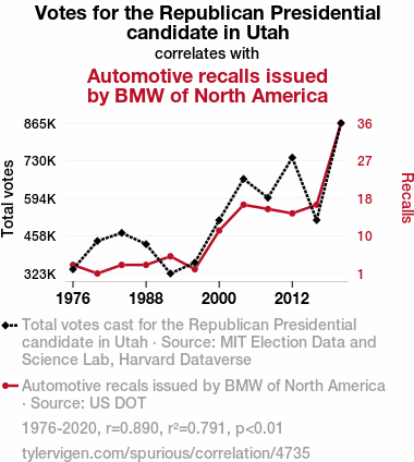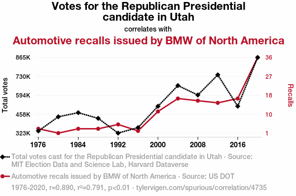 This means 79.1% of the change in the one variable (i.e., Automotive recalls issued by BMW of North America) is predictable based on the change in the other (i.e., Votes for the Republican Presidential candidate in Utah) over the 12 years from 1976 through 2020.